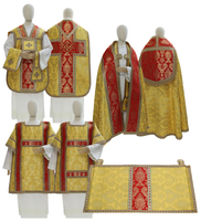 We offer magnificent copes and humeral veils for Easter processions and Solemn Vespers. These ensembles include matching components for the celebrant and assistants. The ample cut of the cope, semicircular shape, and decorative shield on the back create a majestic appearance.